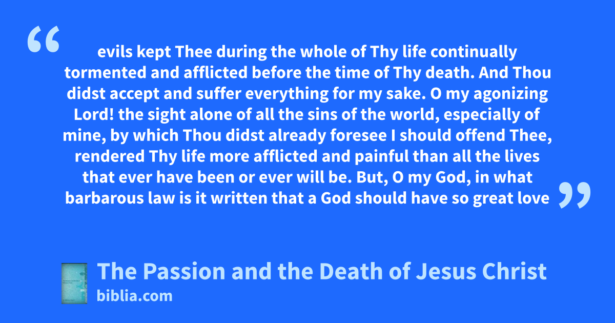 evils kept Thee during the whole of Thy life continually tormented and afflicted before the time of Thy death. And Thou didst accept and suffer everything for my sake. O my agonizing Lord! the sight alone of all the sins of the world, especially of mine, by which Thou didst already foresee I should offend Thee, rendered Thy life more afflicted and painful than all the lives that ever have been or ever will be. But, O my God, in what barbarous law is it written that a God should have so great love