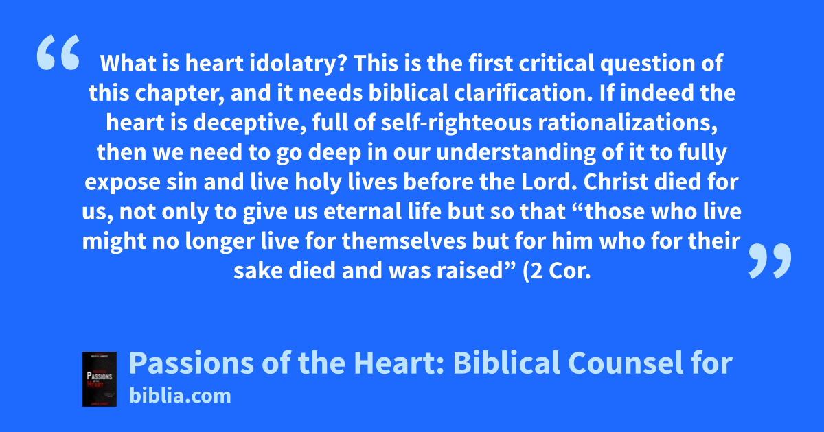 What is heart idolatry? This is the first critical question of this chapter, and it needs biblical clarification. If indeed the heart is deceptive, full of self-righteous rationalizations, then we need to go deep in our understanding of it to fully expose sin and live holy lives before the Lord. Christ died for us, not only to give us eternal life but so that “those who live might no longer live for themselves but for him who for their sake died and was raised” (2 Cor.