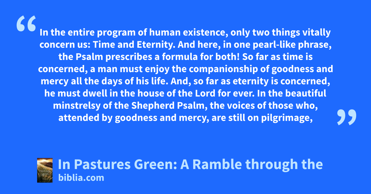 In the entire program of human existence, only two things vitally concern us: Time and Eternity. And here, in one pearl-like phrase, the Psalm prescribes a formula for both! So far as time is concerned, a man must enjoy the companionship of goodness and mercy all the days of his life. And, so far as eternity is concerned, he must dwell in the house of the Lord for ever. In the beautiful minstrelsy of the Shepherd Psalm, the voices of those who, attended by goodness and mercy, are still on pilgrimage,