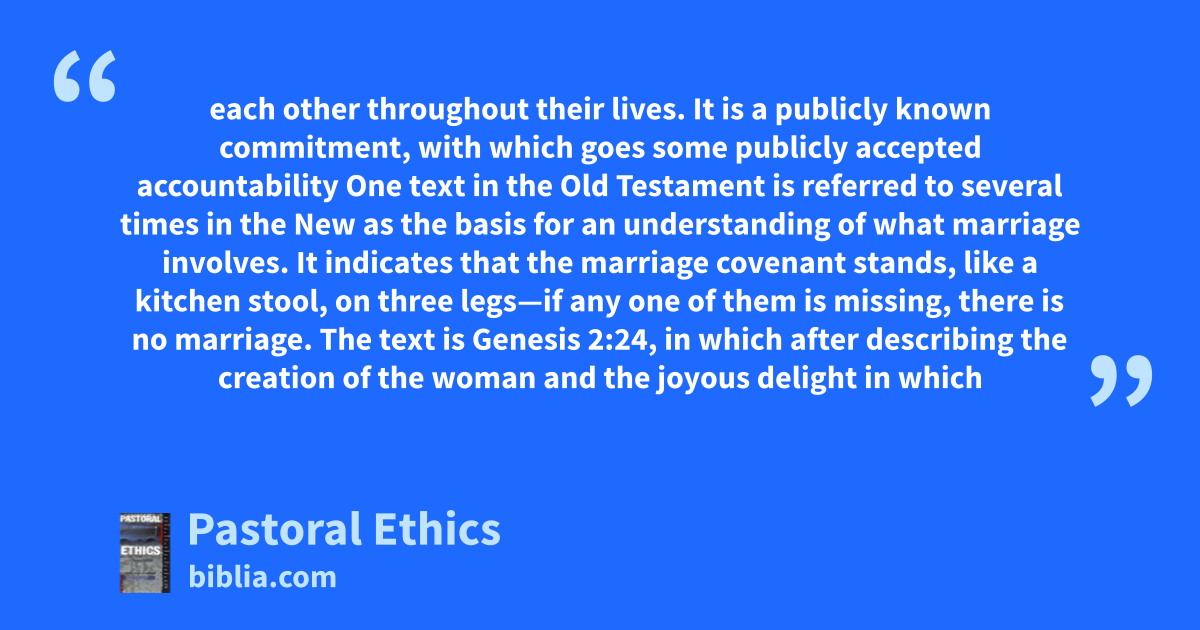 each other throughout their lives. It is a publicly known commitment, with which goes some publicly accepted accountability One text in the Old Testament is referred to several times in the New as the basis for an understanding of what marriage involves. It indicates that the marriage covenant stands, like a kitchen stool, on three legs—if any one of them is missing, there is no marriage. The text is Genesis 2:24, in which after describing the creation of the woman and the joyous delight in which