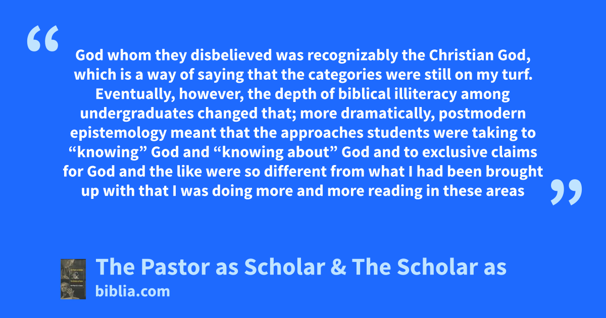 God whom they disbelieved was recognizably the Christian God, which is a way of saying that the categories were still on my turf. Eventually, however, the depth of biblical illiteracy among undergraduates changed that; more dramatically, postmodern epistemology meant that the approaches students were taking to “knowing” God and “knowing about” God and to exclusive claims for God and the like were so different from what I had been brought up with that I was doing more and more reading in these areas