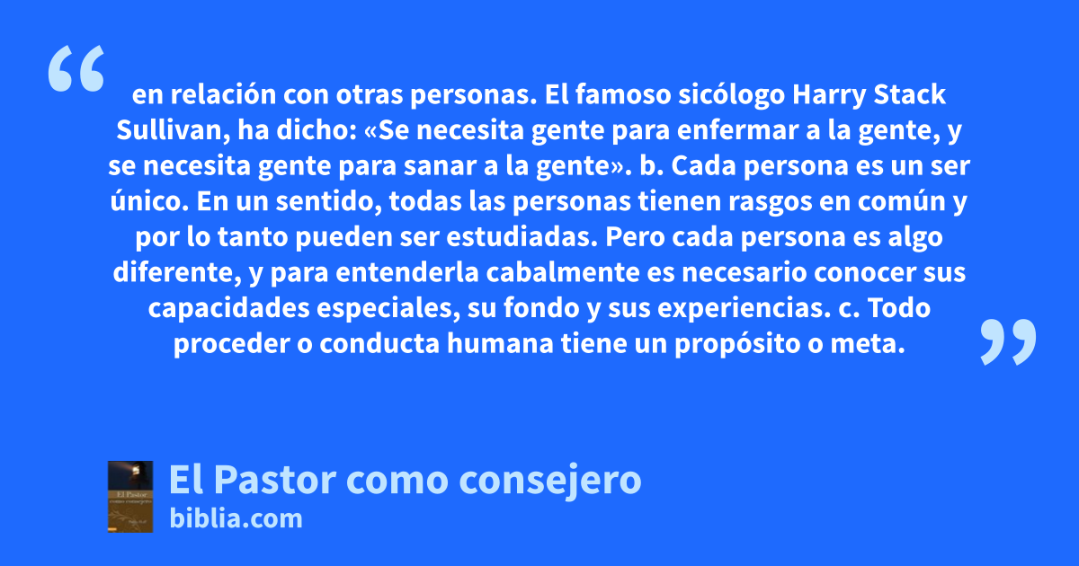 en relación con otras personas. El famoso sicólogo Harry Stack Sullivan, ha dicho: «Se necesita gente para enfermar a la gente, y se necesita gente para sanar a la gente». b. Cada persona es un ser único. En un sentido, todas las personas tienen rasgos en común y por lo tanto pueden ser estudiadas. Pero cada persona es algo diferente, y para entenderla cabalmente es necesario conocer sus capacidades especiales, su fondo y sus experiencias. c. Todo proceder o conducta humana tiene un propósito o meta.