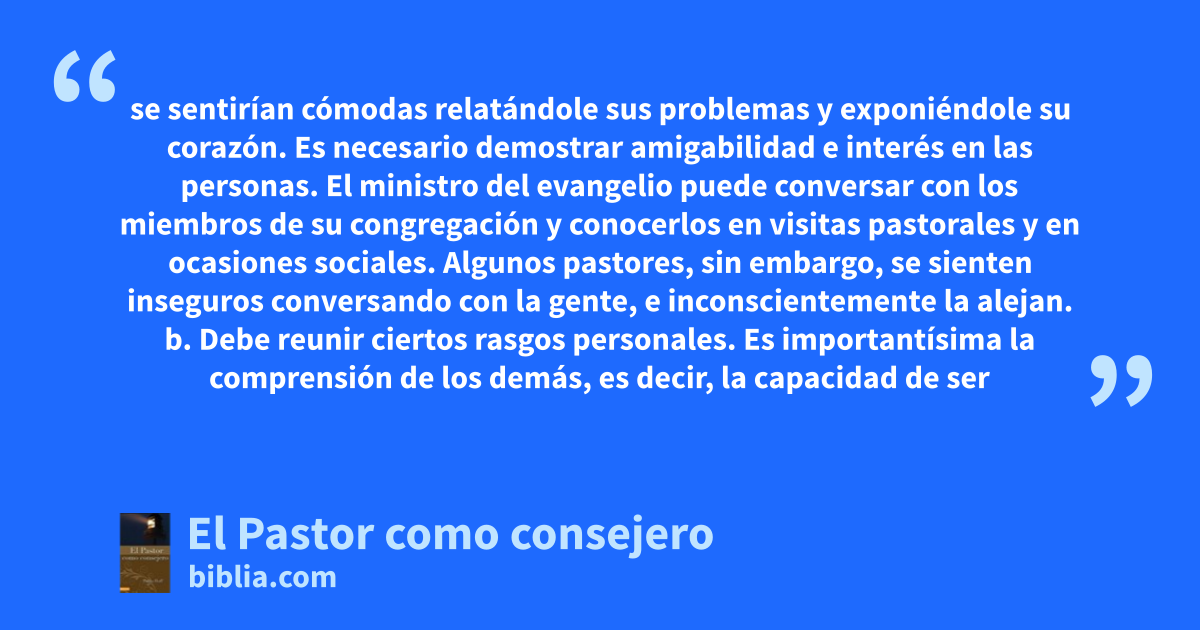 se sentirían cómodas relatándole sus problemas y exponiéndole su corazón. Es necesario demostrar amigabilidad e interés en las personas. El ministro del evangelio puede conversar con los miembros de su congregación y conocerlos en visitas pastorales y en ocasiones sociales. Algunos pastores, sin embargo, se sienten inseguros conversando con la gente, e inconscientemente la alejan. b. Debe reunir ciertos rasgos personales. Es importantísima la comprensión de los demás, es decir, la capacidad de ser
