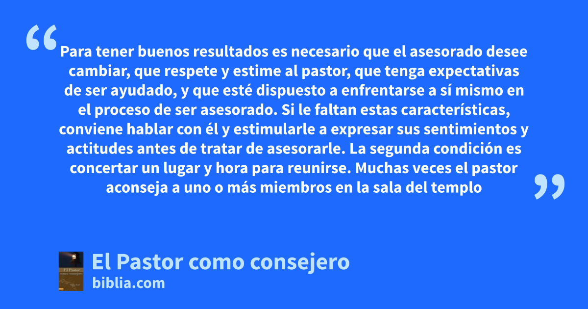 Para tener buenos resultados es necesario que el asesorado desee cambiar, que respete y estime al pastor, que tenga expectativas de ser ayudado, y que esté dispuesto a enfrentarse a sí mismo en el proceso de ser asesorado. Si le faltan estas características, conviene hablar con él y estimularle a expresar sus sentimientos y actitudes antes de tratar de asesorarle. La segunda condición es concertar un lugar y hora para reunirse. Muchas veces el pastor aconseja a uno o más miembros en la sala del templo