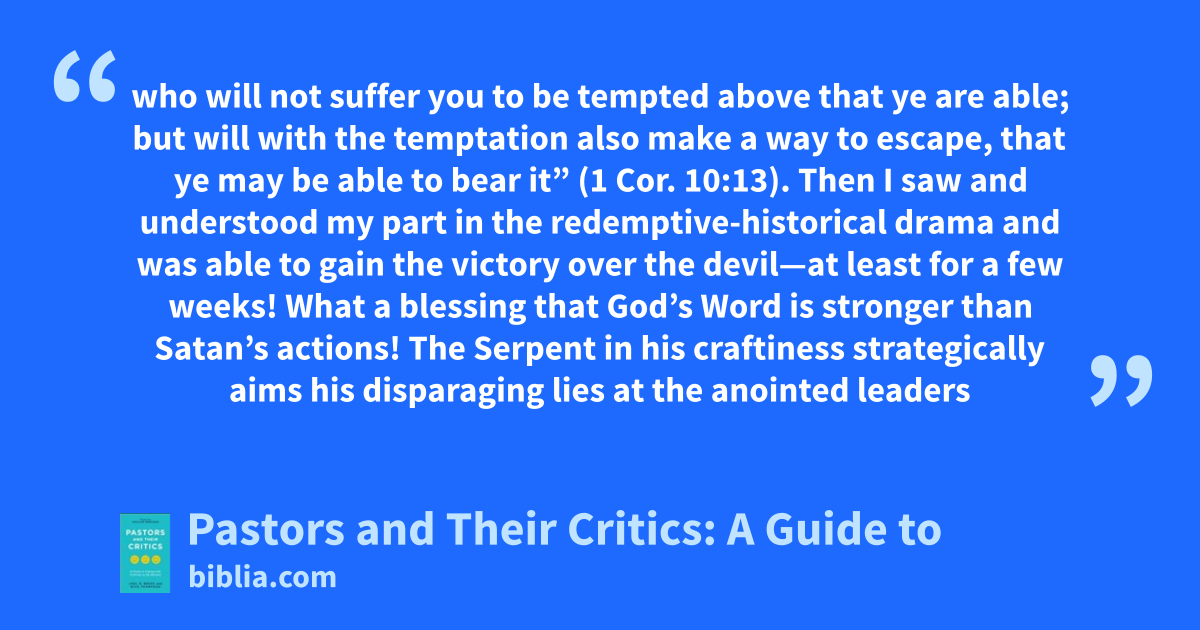 who will not suffer you to be tempted above that ye are able; but will with the temptation also make a way to escape, that ye may be able to bear it” (1 Cor. 10:13). Then I saw and understood my part in the redemptive-historical drama and was able to gain the victory over the devil—at least for a few weeks! What a blessing that God’s Word is stronger than Satan’s actions! The Serpent in his craftiness strategically aims his disparaging lies at the anointed leaders