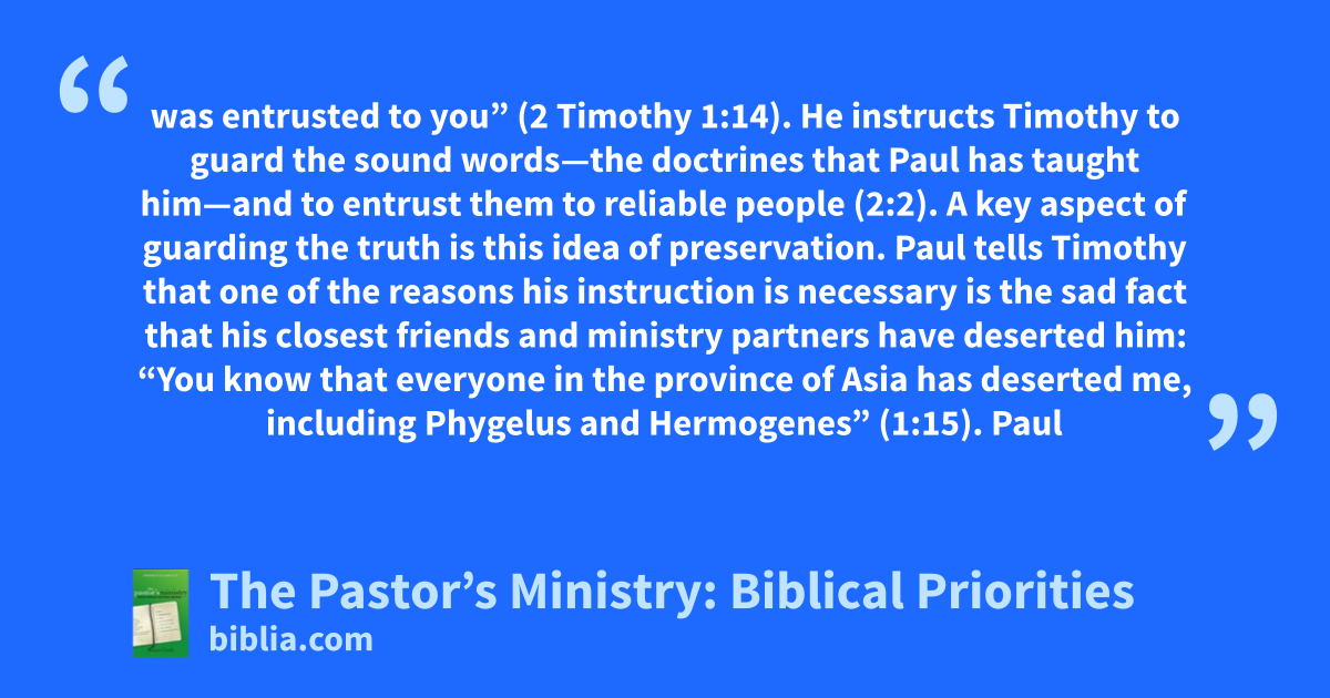 was entrusted to you” (2 Timothy 1:14). He instructs Timothy to guard the sound words—the doctrines that Paul has taught him—and to entrust them to reliable people (2:2). A key aspect of guarding the truth is this idea of preservation. Paul tells Timothy that one of the reasons his instruction is necessary is the sad fact that his closest friends and ministry partners have deserted him: “You know that everyone in the province of Asia has deserted me, including Phygelus and Hermogenes” (1:15). Paul