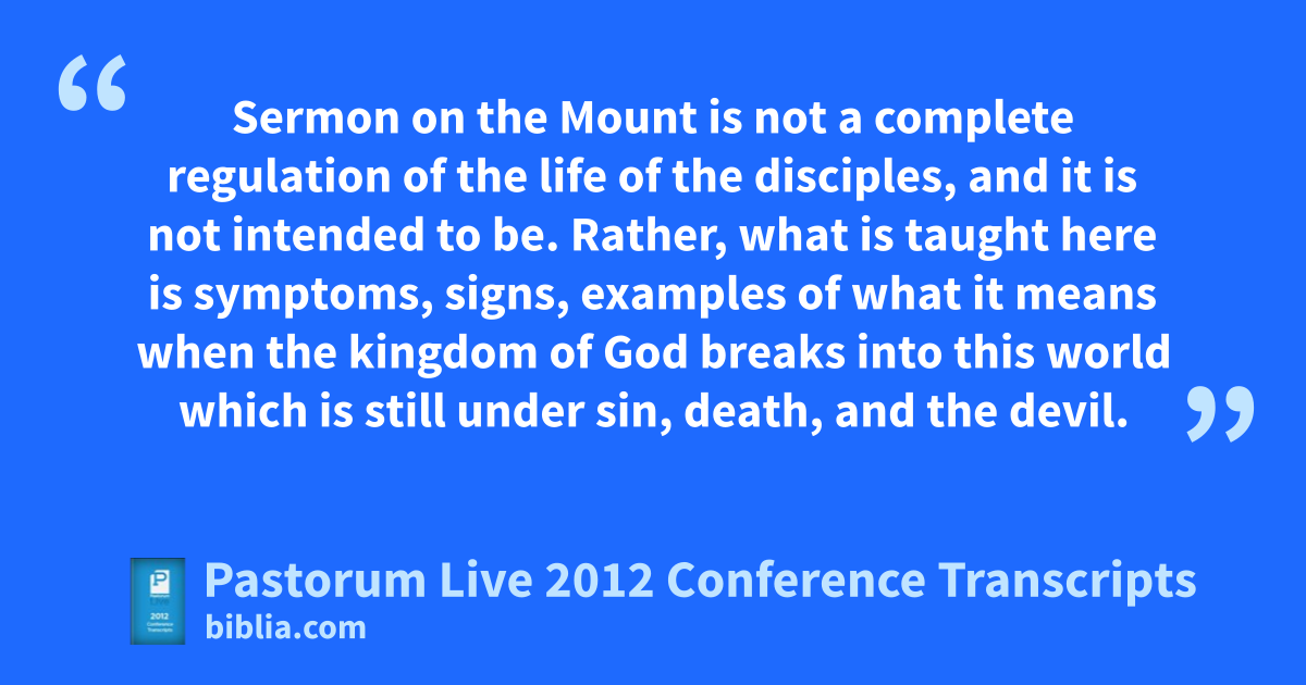 Sermon on the Mount is not a complete regulation of the life of the disciples, and it is not intended to be. Rather, what is taught here is symptoms, signs, examples of what it means when the kingdom of God breaks into this world which is still under sin, death, and the devil.