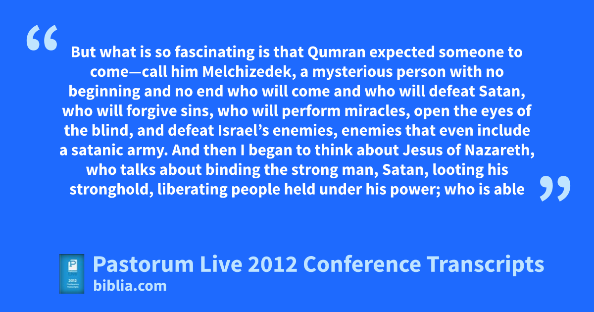 But what is so fascinating is that Qumran expected someone to come—call him Melchizedek, a mysterious person with no beginning and no end who will come and who will defeat Satan, who will forgive sins, who will perform miracles, open the eyes of the blind, and defeat Israel’s enemies, enemies that even include a satanic army. And then I began to think about Jesus of Nazareth, who talks about binding the strong man, Satan, looting his stronghold, liberating people held under his power; who is able