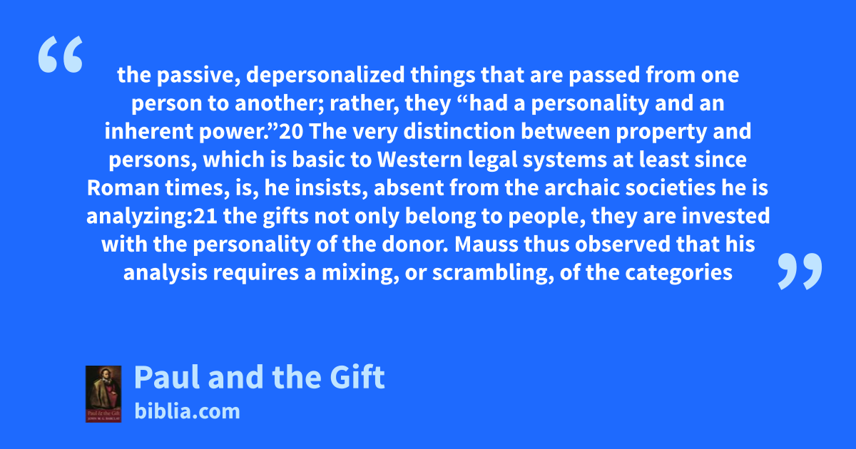 the passive, depersonalized things that are passed from one person to another; rather, they “had a personality and an inherent power.”20 The very distinction between property and persons, which is basic to Western legal systems at least since Roman times, is, he insists, absent from the archaic societies he is analyzing:21 the gifts not only belong to people, they are invested with the personality of the donor. Mauss thus observed that his analysis requires a mixing, or scrambling, of the categories