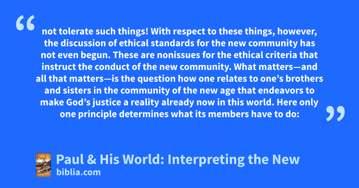 not tolerate such things! With respect to these things, however, the discussion of ethical standards for the new community has not even begun. These are nonissues for the ethical criteria that instruct the conduct of the new community. What matters—and all that matters—is the question how one relates to one’s brothers and sisters in the community of the new age that endeavors to make God’s justice a reality already now in this world. Here only one principle determines what its members have to do: