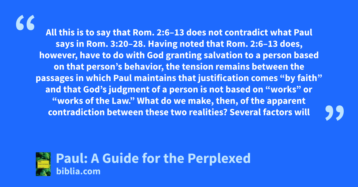 All this is to say that Rom. 2:6–13 does not contradict what Paul says in Rom. 3:20–28. Having noted that Rom. 2:6–13 does, however, have to do with God granting salvation to a person based on that person’s behavior, the tension remains between the passages in which Paul maintains that justification comes “by faith” and that God’s judgment of a person is not based on “works” or “works of the Law.” What do we make, then, of the apparent contradiction between these two realities? Several factors will