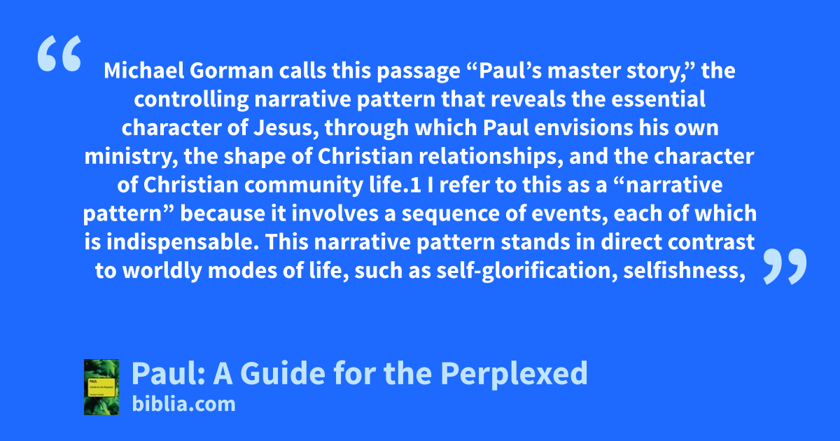 Michael Gorman calls this passage “Paul’s master story,” the controlling narrative pattern that reveals the essential character of Jesus, through which Paul envisions his own ministry, the shape of Christian relationships, and the character of Christian community life.1 I refer to this as a “narrative pattern” because it involves a sequence of events, each of which is indispensable. This narrative pattern stands in direct contrast to worldly modes of life, such as self-glorification, selfishness,