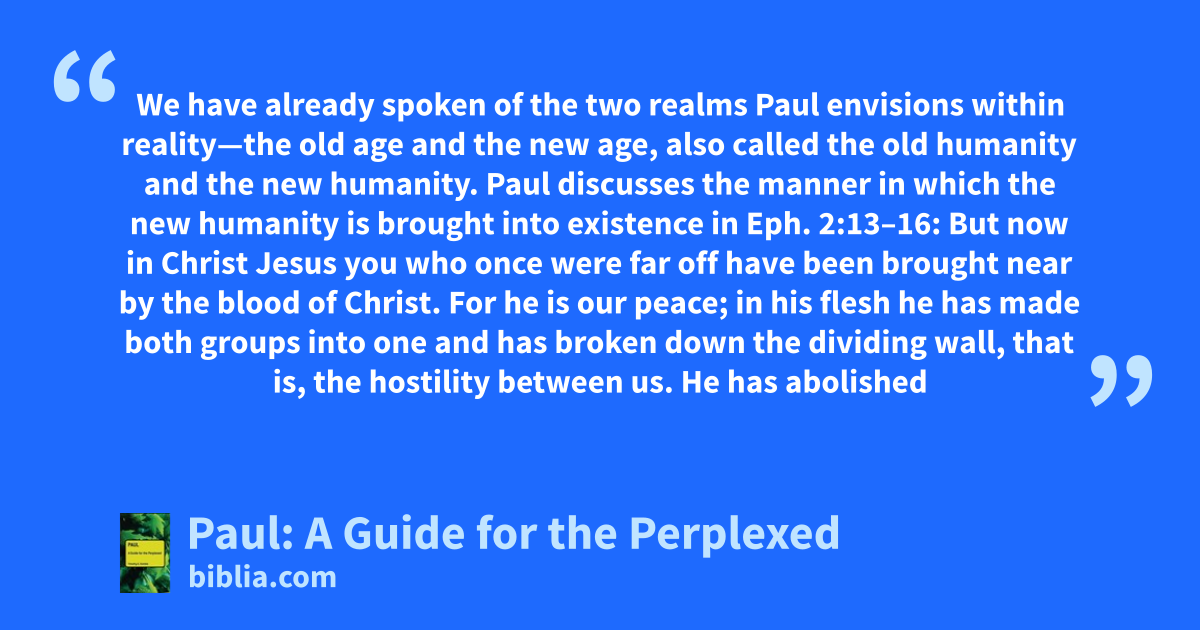 We have already spoken of the two realms Paul envisions within reality—the old age and the new age, also called the old humanity and the new humanity. Paul discusses the manner in which the new humanity is brought into existence in Eph. 2:13–16: But now in Christ Jesus you who once were far off have been brought near by the blood of Christ. For he is our peace; in his flesh he has made both groups into one and has broken down the dividing wall, that is, the hostility between us. He has abolished