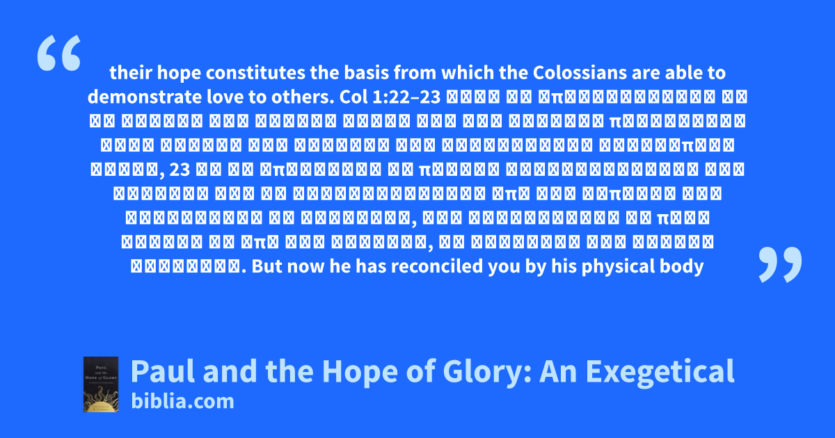 their hope constitutes the basis from which the Colossians are able to demonstrate love to others. Col 1:22–23 νυνὶ δὲ ἀποκατήλλαξεν ἐν τῷ σώματι τῆς σαρκὸς αὐτοῦ διὰ τοῦ θανάτου παραστῆσαι ὑμᾶς ἁγίους καὶ ἀμώμους καὶ ἀνεγκλήτους κατενώπιον αὐτοῦ, 23 εἴ γε ἐπιμένετε τῇ πίστει τεθεμελιωμένοι καὶ ἑδραῖοι καὶ μὴ μετακινούμενοι ἀπὸ τῆς ἐλπίδος τοῦ εὐαγγελίου οὗ ἠκούσατε, τοῦ κηρυχθέντος ἐν πάσῃ κτίσει τῇ ὑπὸ τὸν οὐρανόν, οὗ ἐγενόμην ἐγὼ Παῦλος διάκονος. But now he has reconciled you by his physical body