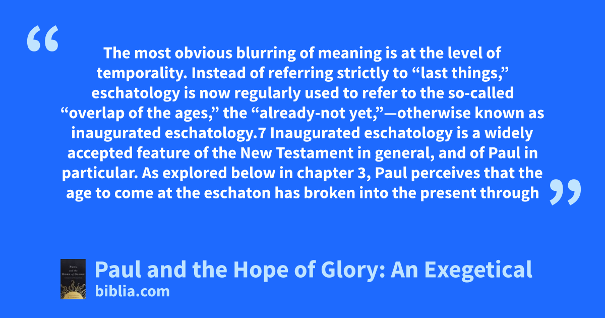 The most obvious blurring of meaning is at the level of temporality. Instead of referring strictly to “last things,” eschatology is now regularly used to refer to the so-called “overlap of the ages,” the “already-not yet,”—otherwise known as inaugurated eschatology.7 Inaugurated eschatology is a widely accepted feature of the New Testament in general, and of Paul in particular. As explored below in chapter 3, Paul perceives that the age to come at the eschaton has broken into the present through