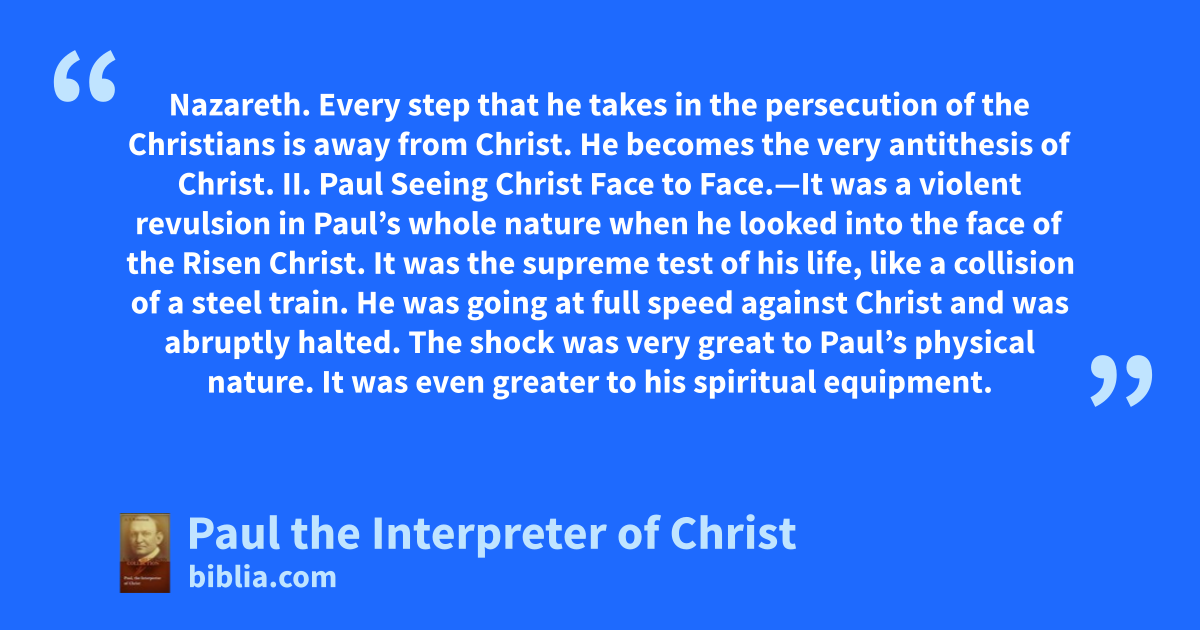 Nazareth. Every step that he takes in the persecution of the Christians is away from Christ. He becomes the very antithesis of Christ. II. Paul Seeing Christ Face to Face.—It was a violent revulsion in Paul’s whole nature when he looked into the face of the Risen Christ. It was the supreme test of his life, like a collision of a steel train. He was going at full speed against Christ and was abruptly halted. The shock was very great to Paul’s physical nature. It was even greater to his spiritual equipment.