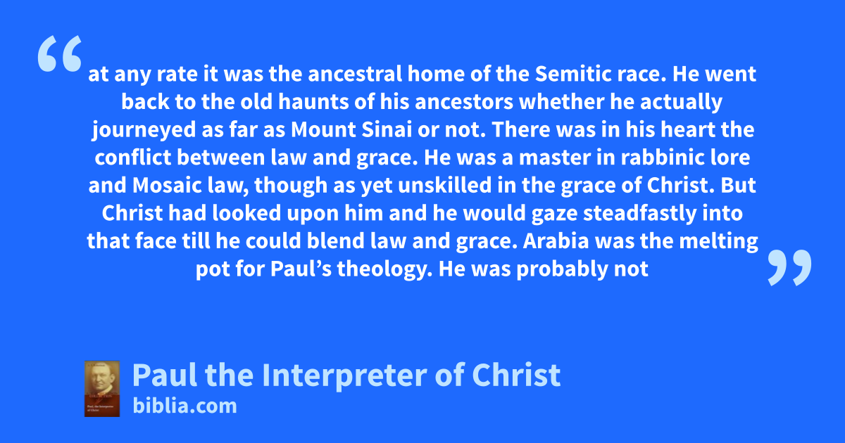 at any rate it was the ancestral home of the Semitic race. He went back to the old haunts of his ancestors whether he actually journeyed as far as Mount Sinai or not. There was in his heart the conflict between law and grace. He was a master in rabbinic lore and Mosaic law, though as yet unskilled in the grace of Christ. But Christ had looked upon him and he would gaze steadfastly into that face till he could blend law and grace. Arabia was the melting pot for Paul’s theology. He was probably not