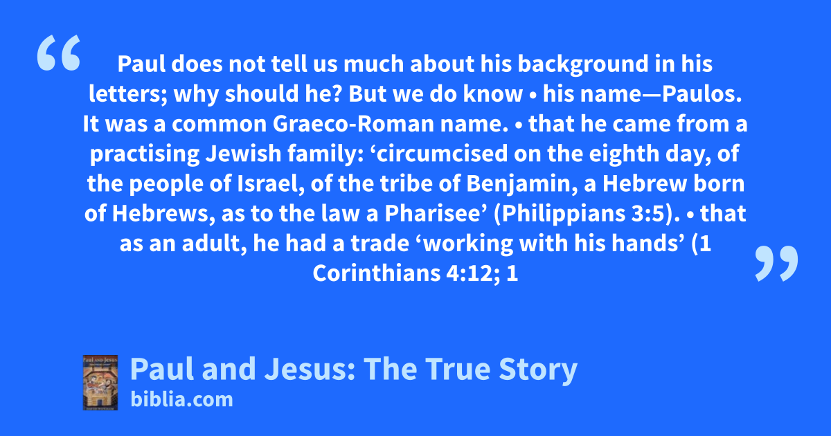 Paul does not tell us much about his background in his letters; why should he? But we do know • his name—Paulos. It was a common Graeco-Roman name. • that he came from a practising Jewish family: ‘circumcised on the eighth day, of the people of Israel, of the tribe of Benjamin, a Hebrew born of Hebrews, as to the law a Pharisee’ (Philippians 3:5). • that as an adult, he had a trade ‘working with his hands’ (1 Corinthians 4:12; 1
