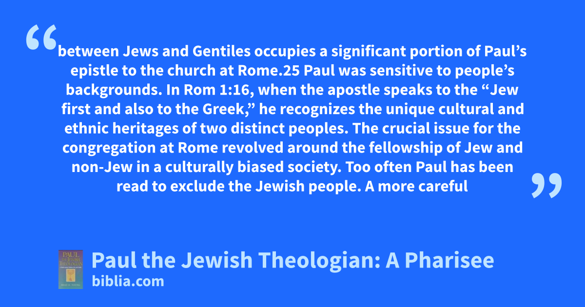 between Jews and Gentiles occupies a significant portion of Paul’s epistle to the church at Rome.25 Paul was sensitive to people’s backgrounds. In Rom 1:16, when the apostle speaks to the “Jew first and also to the Greek,” he recognizes the unique cultural and ethnic heritages of two distinct peoples. The crucial issue for the congregation at Rome revolved around the fellowship of Jew and non-Jew in a culturally biased society. Too often Paul has been read to exclude the Jewish people. A more careful