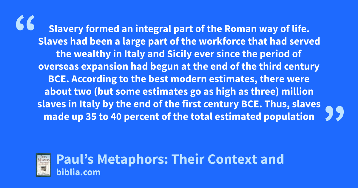 Slavery formed an integral part of the Roman way of life. Slaves had been a large part of the workforce that had served the wealthy in Italy and Sicily ever since the period of overseas expansion had begun at the end of the third century BCE. According to the best modern estimates, there were about two (but some estimates go as high as three) million slaves in Italy by the end of the first century BCE. Thus, slaves made up 35 to 40 percent of the total estimated population