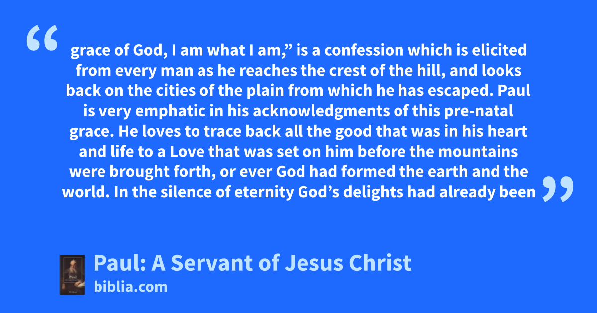 grace of God, I am what I am,” is a confession which is elicited from every man as he reaches the crest of the hill, and looks back on the cities of the plain from which he has escaped. Paul is very emphatic in his acknowledgments of this pre-natal grace. He loves to trace back all the good that was in his heart and life to a Love that was set on him before the mountains were brought forth, or ever God had formed the earth and the world. In the silence of eternity God’s delights had already been