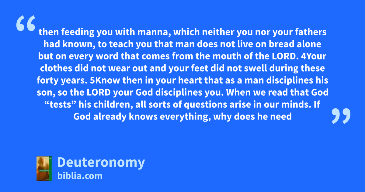 then feeding you with manna, which neither you nor your fathers had known, to teach you that man does not live on bread alone but on every word that comes from the mouth of the LORD. 4Your clothes did not wear out and your feet did not swell during these forty years. 5Know then in your heart that as a man disciplines his son, so the LORD your God disciplines you. When we read that God “tests” his children, all sorts of questions arise in our minds. If God already knows everything, why does he need