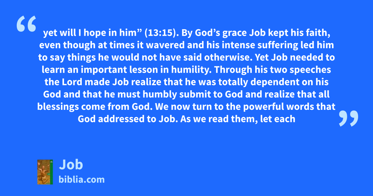 yet will I hope in him” (13:15). By God’s grace Job kept his faith, even though at times it wavered and his intense suffering led him to say things he would not have said otherwise. Yet Job needed to learn an important lesson in humility. Through his two speeches the Lord made Job realize that he was totally dependent on his God and that he must humbly submit to God and realize that all blessings come from God. We now turn to the powerful words that God addressed to Job. As we read them, let each