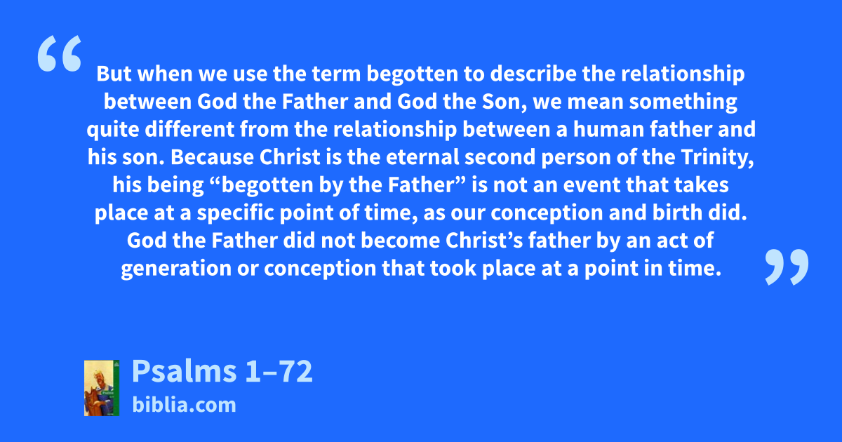But when we use the term begotten to describe the relationship between God the Father and God the Son, we mean something quite different from the relationship between a human father and his son. Because Christ is the eternal second person of the Trinity, his being “begotten by the Father” is not an event that takes place at a specific point of time, as our conception and birth did. God the Father did not become Christ’s father by an act of generation or conception that took place at a point in time.