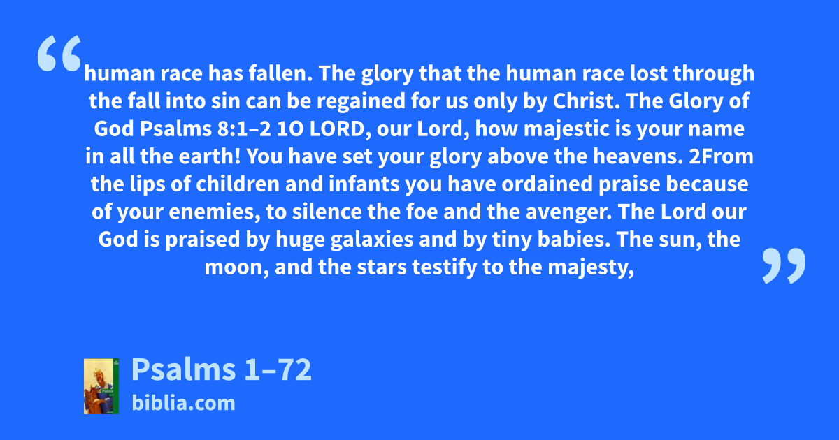human race has fallen. The glory that the human race lost through the fall into sin can be regained for us only by Christ. The Glory of God Psalms 8:1–2 1O LORD, our Lord, how majestic is your name in all the earth! You have set your glory above the heavens. 2From the lips of children and infants you have ordained praise because of your enemies, to silence the foe and the avenger. The Lord our God is praised by huge galaxies and by tiny babies. The sun, the moon, and the stars testify to the majesty,