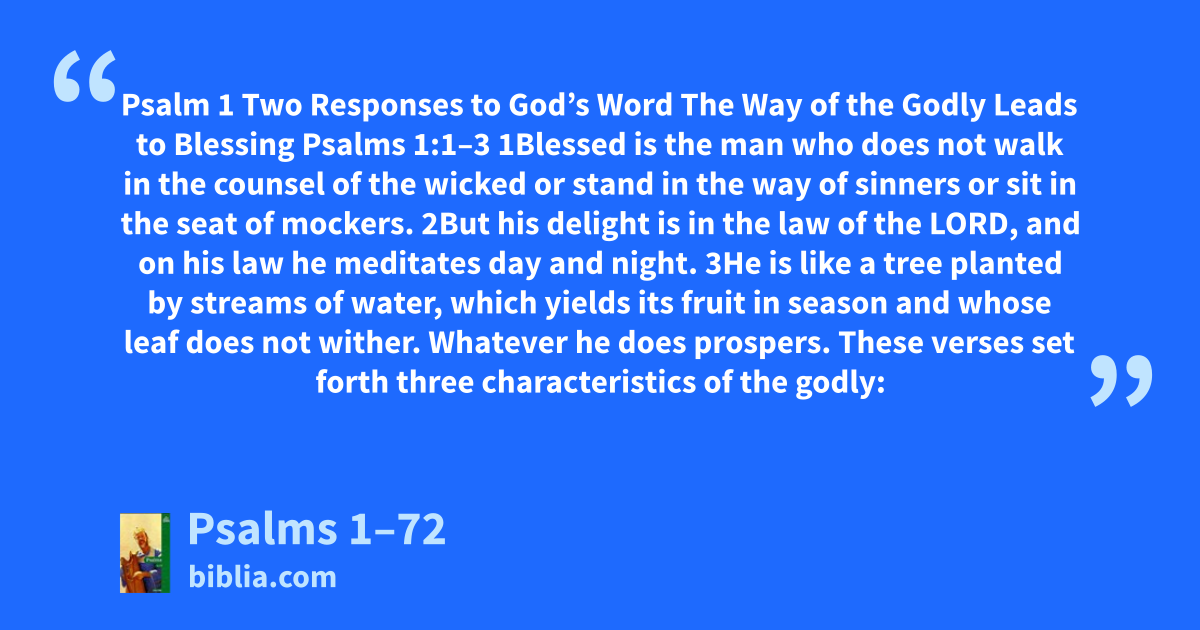 Psalm 1 Two Responses to God’s Word The Way of the Godly Leads to Blessing Psalms 1:1–3 1Blessed is the man who does not walk in the counsel of the wicked or stand in the way of sinners or sit in the seat of mockers. 2But his delight is in the law of the LORD, and on his law he meditates day and night. 3He is like a tree planted by streams of water, which yields its fruit in season and whose leaf does not wither. Whatever he does prospers. These verses set forth three characteristics of the godly: