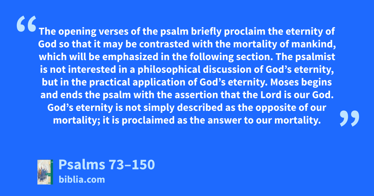 The opening verses of the psalm briefly proclaim the eternity of God so that it may be contrasted with the mortality of mankind, which will be emphasized in the following section. The psalmist is not interested in a philosophical discussion of God’s eternity, but in the practical application of God’s eternity. Moses begins and ends the psalm with the assertion that the Lord is our God. God’s eternity is not simply described as the opposite of our mortality; it is proclaimed as the answer to our mortality.
