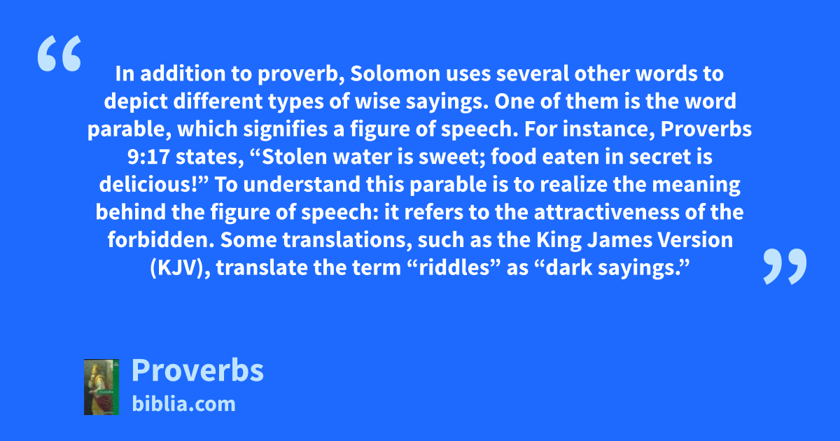 In addition to proverb, Solomon uses several other words to depict different types of wise sayings. One of them is the word parable, which signifies a figure of speech. For instance, Proverbs 9:17 states, “Stolen water is sweet; food eaten in secret is delicious!” To understand this parable is to realize the meaning behind the figure of speech: it refers to the attractiveness of the forbidden. Some translations, such as the King James Version (KJV), translate the term “riddles” as “dark sayings.”