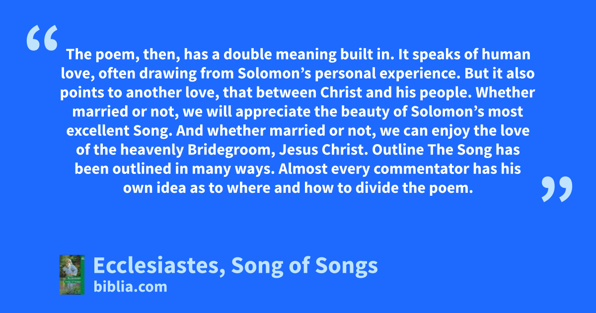 The poem, then, has a double meaning built in. It speaks of human love, often drawing from Solomon’s personal experience. But it also points to another love, that between Christ and his people. Whether married or not, we will appreciate the beauty of Solomon’s most excellent Song. And whether married or not, we can enjoy the love of the heavenly Bridegroom, Jesus Christ. Outline The Song has been outlined in many ways. Almost every commentator has his own idea as to where and how to divide the poem.