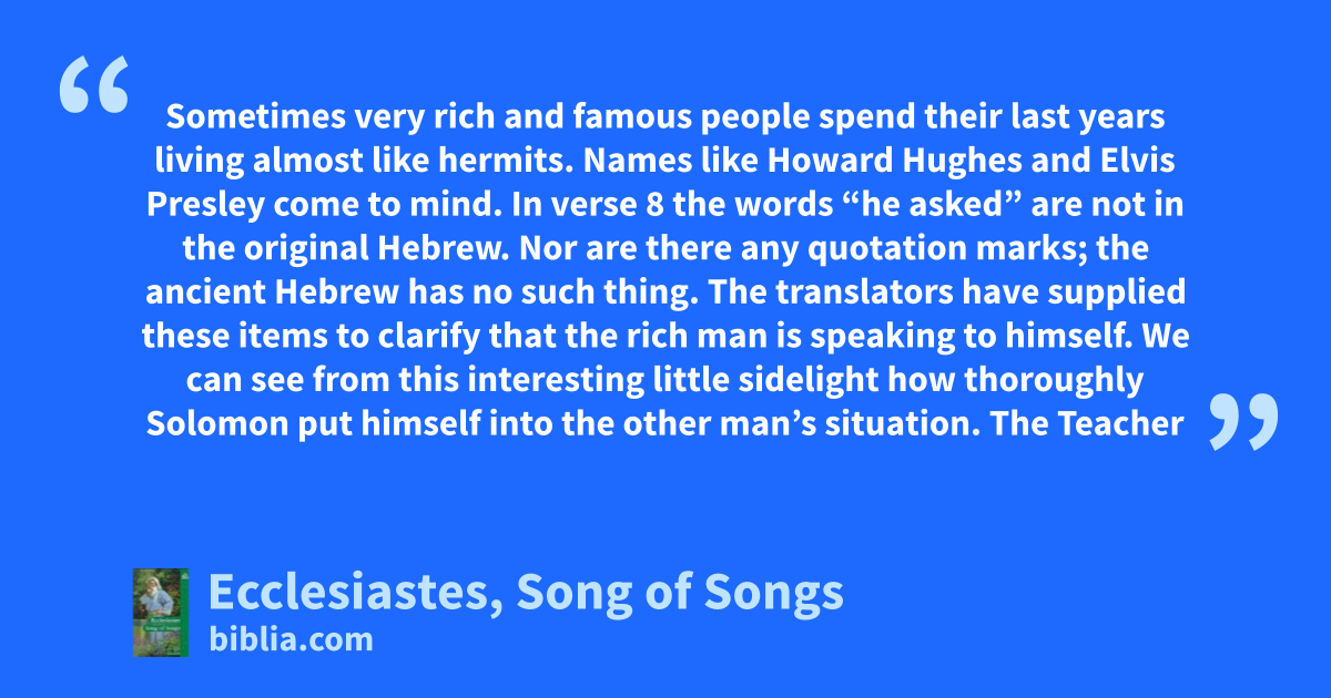 Sometimes very rich and famous people spend their last years living almost like hermits. Names like Howard Hughes and Elvis Presley come to mind. In verse 8 the words “he asked” are not in the original Hebrew. Nor are there any quotation marks; the ancient Hebrew has no such thing. The translators have supplied these items to clarify that the rich man is speaking to himself. We can see from this interesting little sidelight how thoroughly Solomon put himself into the other man’s situation. The Teacher