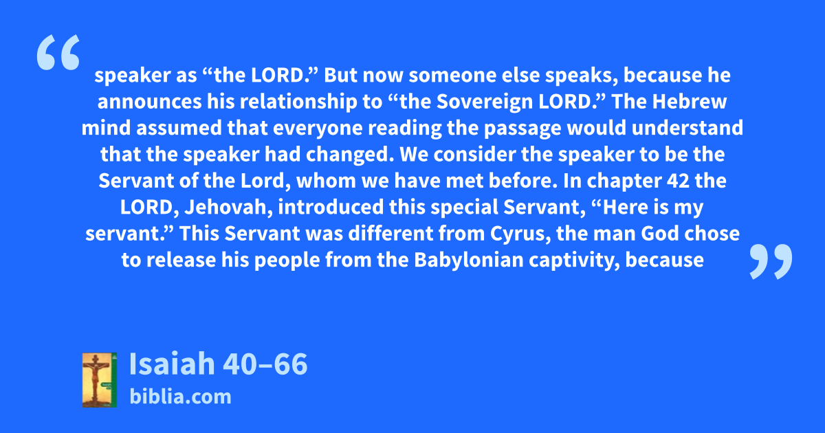 speaker as “the LORD.” But now someone else speaks, because he announces his relationship to “the Sovereign LORD.” The Hebrew mind assumed that everyone reading the passage would understand that the speaker had changed. We consider the speaker to be the Servant of the Lord, whom we have met before. In chapter 42 the LORD, Jehovah, introduced this special Servant, “Here is my servant.” This Servant was different from Cyrus, the man God chose to release his people from the Babylonian captivity, because