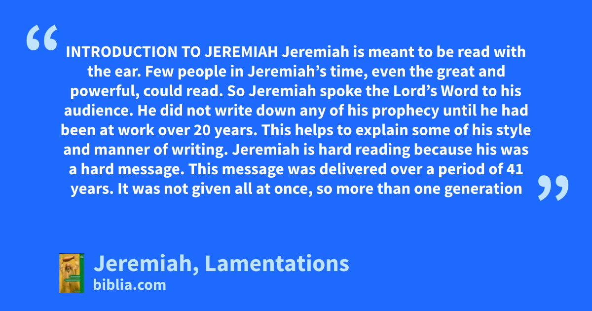INTRODUCTION TO JEREMIAH Jeremiah is meant to be read with the ear. Few people in Jeremiah’s time, even the great and powerful, could read. So Jeremiah spoke the Lord’s Word to his audience. He did not write down any of his prophecy until he had been at work over 20 years. This helps to explain some of his style and manner of writing. Jeremiah is hard reading because his was a hard message. This message was delivered over a period of 41 years. It was not given all at once, so more than one generation