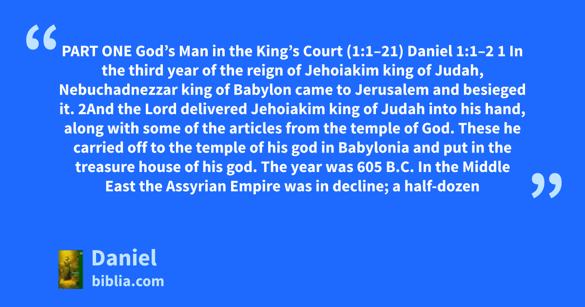 PART ONE God’s Man in the King’s Court (1:1–21) Daniel 1:1–2 1 In the third year of the reign of Jehoiakim king of Judah, Nebuchadnezzar king of Babylon came to Jerusalem and besieged it. 2And the Lord delivered Jehoiakim king of Judah into his hand, along with some of the articles from the temple of God. These he carried off to the temple of his god in Babylonia and put in the treasure house of his god. The year was 605 B.C. In the Middle East the Assyrian Empire was in decline; a half-dozen