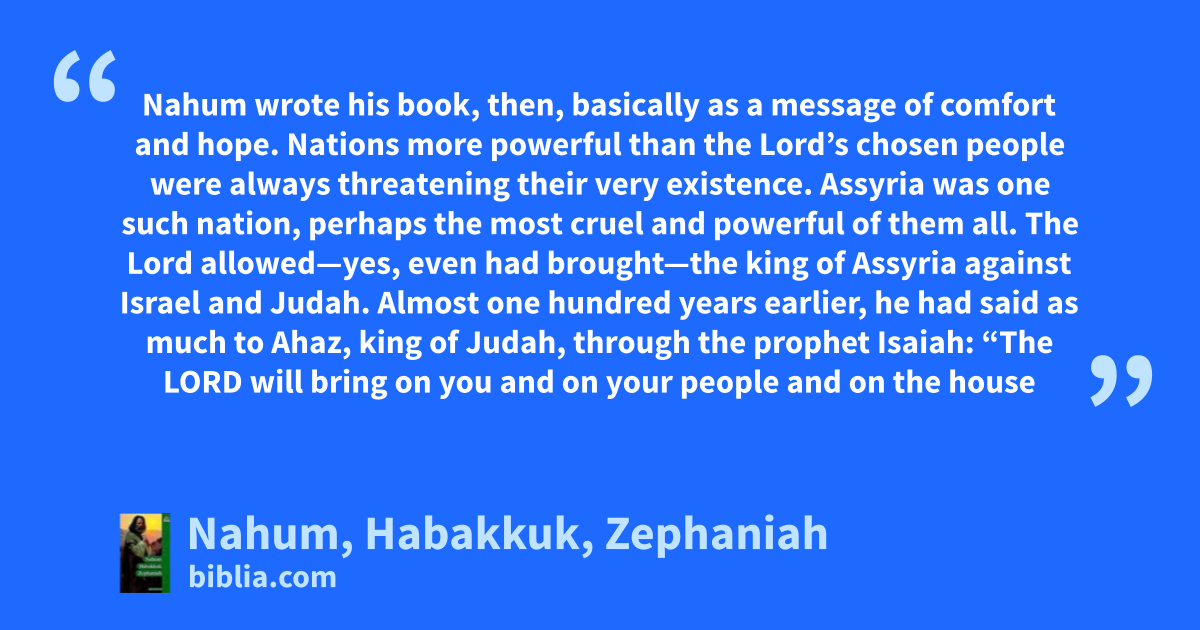 Nahum wrote his book, then, basically as a message of comfort and hope. Nations more powerful than the Lord’s chosen people were always threatening their very existence. Assyria was one such nation, perhaps the most cruel and powerful of them all. The Lord allowed—yes, even had brought—the king of Assyria against Israel and Judah. Almost one hundred years earlier, he had said as much to Ahaz, king of Judah, through the prophet Isaiah: “The LORD will bring on you and on your people and on the house