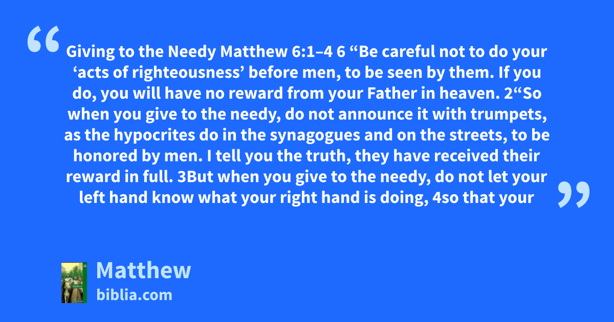 Giving to the Needy Matthew 6:1–4 6 “Be careful not to do your ‘acts of righteousness’ before men, to be seen by them. If you do, you will have no reward from your Father in heaven. 2“So when you give to the needy, do not announce it with trumpets, as the hypocrites do in the synagogues and on the streets, to be honored by men. I tell you the truth, they have received their reward in full. 3But when you give to the needy, do not let your left hand know what your right hand is doing, 4so that your