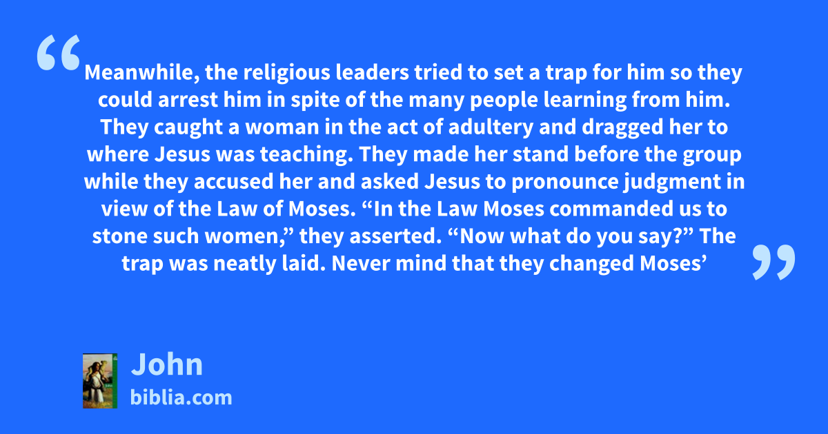 Meanwhile, the religious leaders tried to set a trap for him so they could arrest him in spite of the many people learning from him. They caught a woman in the act of adultery and dragged her to where Jesus was teaching. They made her stand before the group while they accused her and asked Jesus to pronounce judgment in view of the Law of Moses. “In the Law Moses commanded us to stone such women,” they asserted. “Now what do you say?” The trap was neatly laid. Never mind that they changed Moses’
