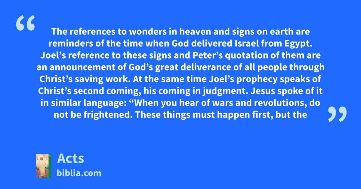 The references to wonders in heaven and signs on earth are reminders of the time when God delivered Israel from Egypt. Joel’s reference to these signs and Peter’s quotation of them are an announcement of God’s great deliverance of all people through Christ’s saving work. At the same time Joel’s prophecy speaks of Christ’s second coming, his coming in judgment. Jesus spoke of it in similar language: “When you hear of wars and revolutions, do not be frightened. These things must happen first, but the