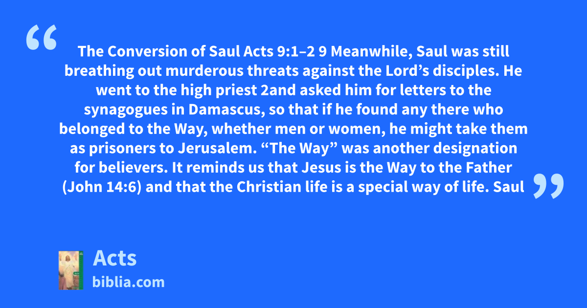 The Conversion of Saul Acts 9:1–2 9 Meanwhile, Saul was still breathing out murderous threats against the Lord’s disciples. He went to the high priest 2and asked him for letters to the synagogues in Damascus, so that if he found any there who belonged to the Way, whether men or women, he might take them as prisoners to Jerusalem. “The Way” was another designation for believers. It reminds us that Jesus is the Way to the Father (John 14:6) and that the Christian life is a special way of life. Saul