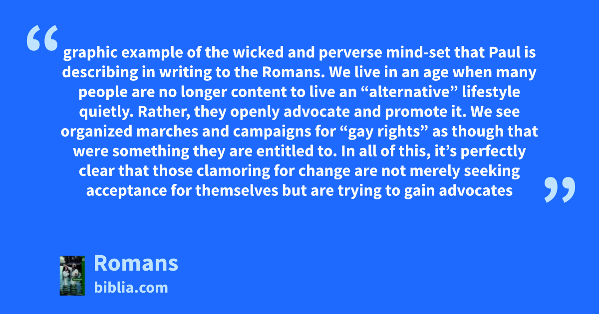 graphic example of the wicked and perverse mind-set that Paul is describing in writing to the Romans. We live in an age when many people are no longer content to live an “alternative” lifestyle quietly. Rather, they openly advocate and promote it. We see organized marches and campaigns for “gay rights” as though that were something they are entitled to. In all of this, it’s perfectly clear that those clamoring for change are not merely seeking acceptance for themselves but are trying to gain advocates