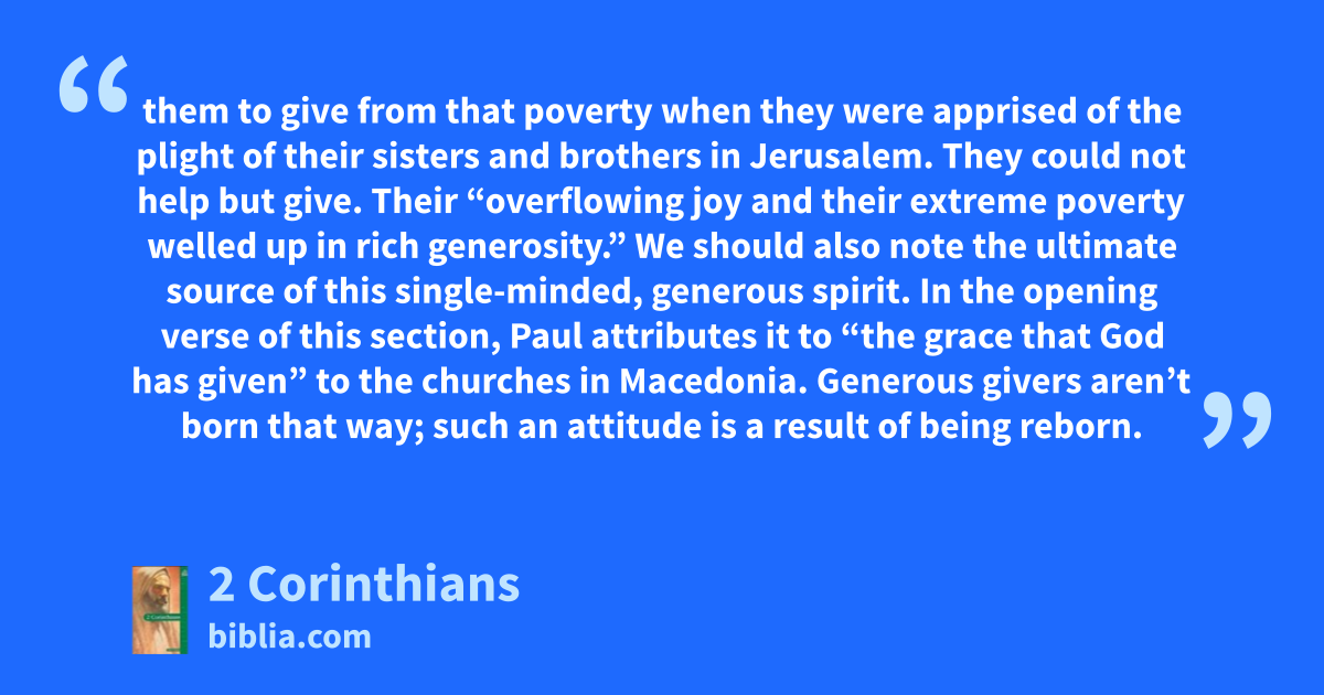 them to give from that poverty when they were apprised of the plight of their sisters and brothers in Jerusalem. They could not help but give. Their “overflowing joy and their extreme poverty welled up in rich generosity.” We should also note the ultimate source of this single-minded, generous spirit. In the opening verse of this section, Paul attributes it to “the grace that God has given” to the churches in Macedonia. Generous givers aren’t born that way; such an attitude is a result of being reborn.