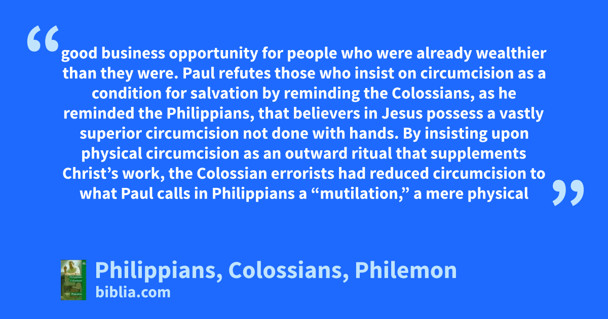 good business opportunity for people who were already wealthier than they were. Paul refutes those who insist on circumcision as a condition for salvation by reminding the Colossians, as he reminded the Philippians, that believers in Jesus possess a vastly superior circumcision not done with hands. By insisting upon physical circumcision as an outward ritual that supplements Christ’s work, the Colossian errorists had reduced circumcision to what Paul calls in Philippians a “mutilation,” a mere physical