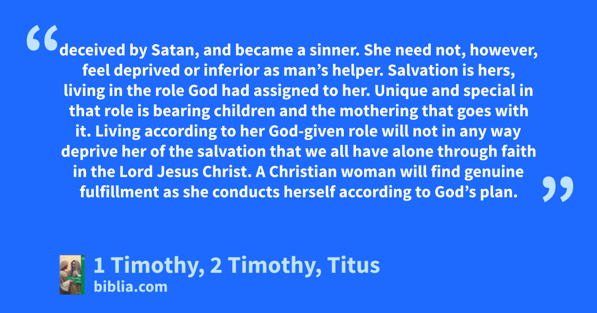 deceived by Satan, and became a sinner. She need not, however, feel deprived or inferior as man’s helper. Salvation is hers, living in the role God had assigned to her. Unique and special in that role is bearing children and the mothering that goes with it. Living according to her God-given role will not in any way deprive her of the salvation that we all have alone through faith in the Lord Jesus Christ. A Christian woman will find genuine fulfillment as she conducts herself according to God’s plan.