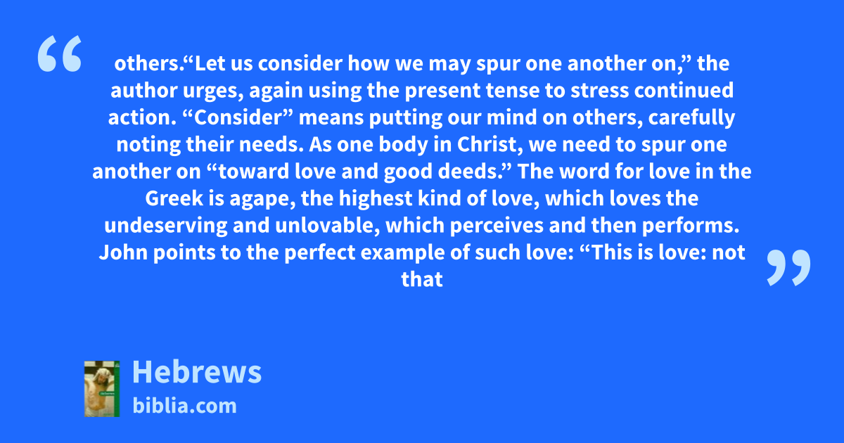 others.“Let us consider how we may spur one another on,” the author urges, again using the present tense to stress continued action. “Consider” means putting our mind on others, carefully noting their needs. As one body in Christ, we need to spur one another on “toward love and good deeds.” The word for love in the Greek is agape, the highest kind of love, which loves the undeserving and unlovable, which perceives and then performs. John points to the perfect example of such love: “This is love: not that