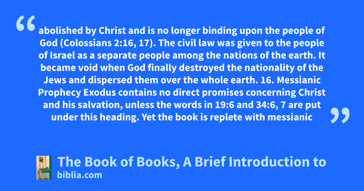 abolished by Christ and is no longer binding upon the people of God (Colossians 2:16, 17). The civil law was given to the people of Israel as a separate people among the nations of the earth. It became void when God finally destroyed the nationality of the Jews and dispersed them over the whole earth. 16. Messianic Prophecy Exodus contains no direct promises concerning Christ and his salvation, unless the words in 19:6 and 34:6, 7 are put under this heading. Yet the book is replete with messianic