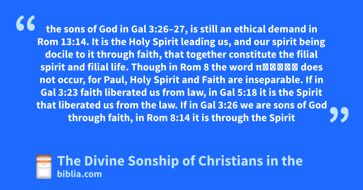 the sons of God in Gal 3:26–27, is still an ethical demand in Rom 13:14. It is the Holy Spirit leading us, and our spirit being docile to it through faith, that together constitute the filial spirit and filial life. Though in Rom 8 the word πίστις does not occur, for Paul, Holy Spirit and Faith are inseparable. If in Gal 3:23 faith liberated us from law, in Gal 5:18 it is the Spirit that liberated us from the law. If in Gal 3:26 we are sons of God through faith, in Rom 8:14 it is through the Spirit