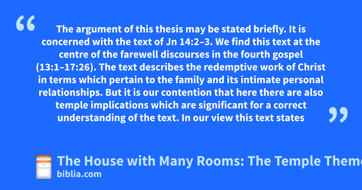 The argument of this thesis may be stated briefly. It is concerned with the text of Jn 14:2–3. We find this text at the centre of the farewell discourses in the fourth gospel (13:1–17:26). The text describes the redemptive work of Christ in terms which pertain to the family and its intimate personal relationships. But it is our contention that here there are also temple implications which are significant for a correct understanding of the text. In our view this text states